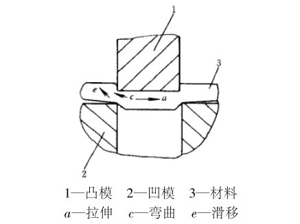 材料受压力作用,开始滑移,材料内部产生拉伸力和弯曲力矩,由于间隙存在,靠近凸模下的材料弯曲变形大,开始出现剪断。