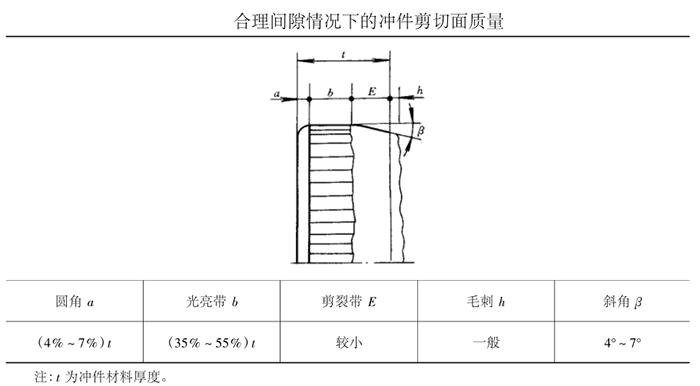 b、合理间隙情况下,冲件剪切面质量见下表。