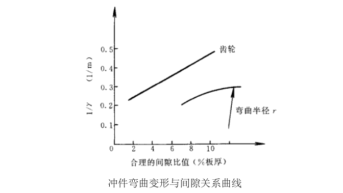 下图是冲件的弯曲变形与凸凹模间隙的关系曲线。间隙的比值愈大,则愈容易产生弯曲变形。